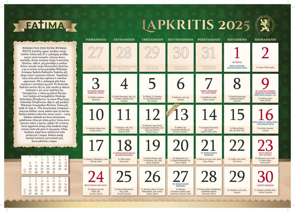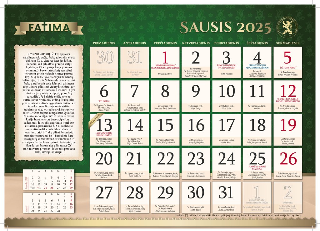 Trečia, kalendorių puošia mūsų Tėvynės Lietuvos vaizdai, primenantys Dievo sukurto pasaulio grožį ir žmonių kūriniams. Šį kartą pristatome gražiausių Lietuvos pilių ir rūmų apžvalgą. Rūmai ir pilys – tai senosios kultūros, neatsiejamos nuo šventojo katalikų tikėjimo, vieta. Tiesą sakant, kultūra gali būti tik katalikiška. Ir jei dabar norime į ją sugrįžti, kelias veda tik per senąjį šios kultūros grožį, deja, beveik sunaikintą per XX ir XXI a. revoliucinius įvykius.