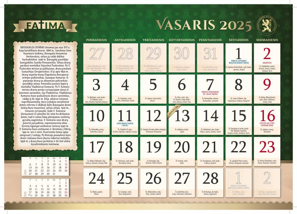 Esame tikri, kad šis kalendorius – puiki dovana Jūsų artimiesiems ir draugams, radusiems ar ieškantiems tikėjimo. Tai vienu metu namų puošmena ir praktiškas įrankis, naudingas kiekvieno kasdienybėje. Galiausiai tai priminimas, kad kiekvieną dieną mus lydi Viešpaties ir Marijos globa.