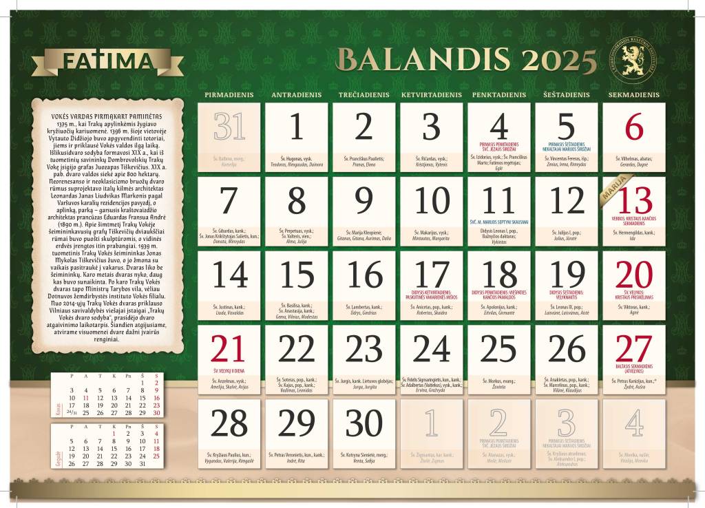 Pirma, tai liturginis kalendorius, kuriame rasite visas svarbiausias metų šventes, minėtinas dienas ir atlaidus, išskirtinį dėmesį skiriant Švenčiausiajai Mergelei Marijai ir su Ja susijusioms datoms.